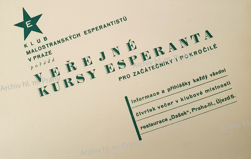 Jazyk esperanto vymyslel v druhé polovině 19. století Ludvík Lazar Zamenhof, jeho cílem bylo vytvořit neutrální a gramaticky jednoduchý jazyk, který by sloužil mezinárodní komunikaci. První učebnice esperanta vyšla roku 1887 ve Varšavě a jazyk se brzy začal šířit ve světě. Její český překlad vyšel již roku 1890 a zájemci o esperanto se sdružovali v místních esperantistických klubech. V Praze byl první klub založen roku 1902, jeho dokumenty jsou uloženy v Literárním archivu Památníku národního písemnictví ve fondu Klub esperantistů v Praze - spolkový archiv. Pražský spolkový katastr nám dokládá, že esperantistických klubů v jednotlivých městských částech Prahy působilo více, v Archivu hl. m. Prahy je ale uložen jediný fond takového spolku. Jedná se o Klub malostranských esperantistů (NAD 616), který byl nyní uspořádán a je přístupný badatelům.